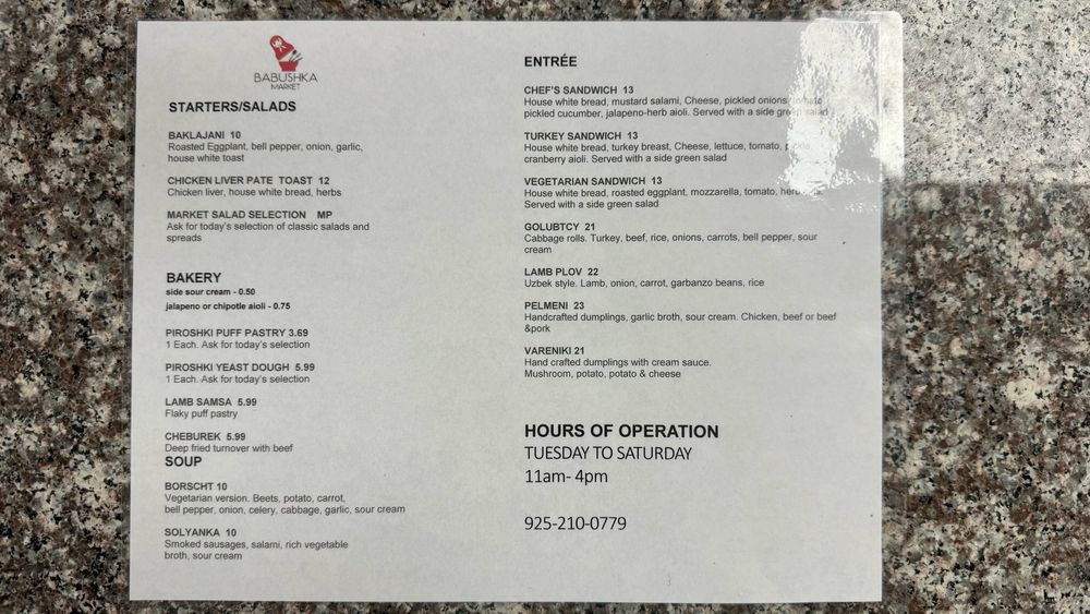 Welcome to Babushka Market & Deli, a culinary gem nestled in Walnut Creek, CA. This inviting deli offers a unique fusion of flavors that cater to diverse dietary preferences, including pescatarian and vegan options. From the moment you step in, you're greeted by a classy yet cozy atmosphere, perfect for families or groups looking to enjoy a meal together.